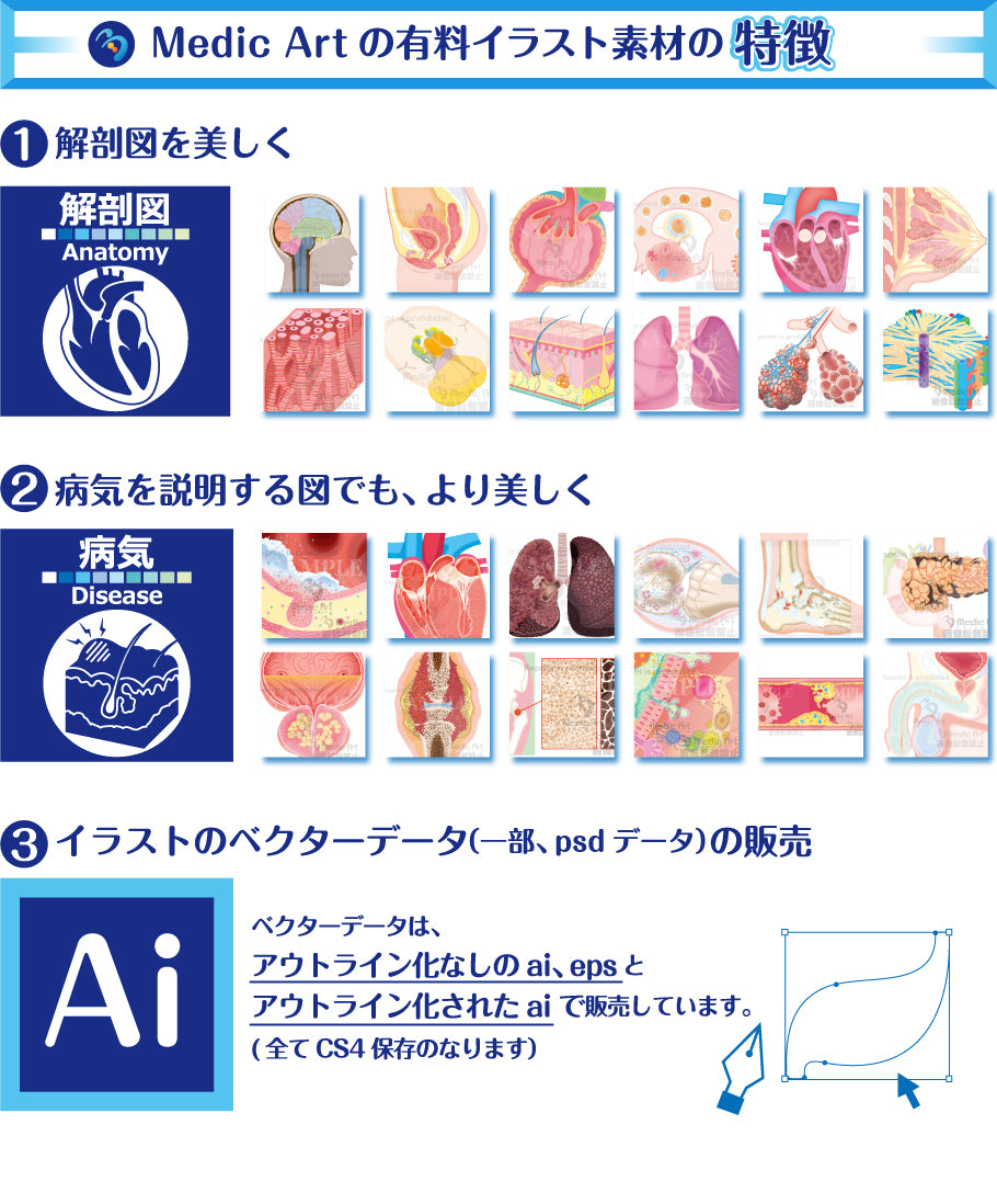 医療に特化したイラスト素材をベクターデータと画像データで提供しています。